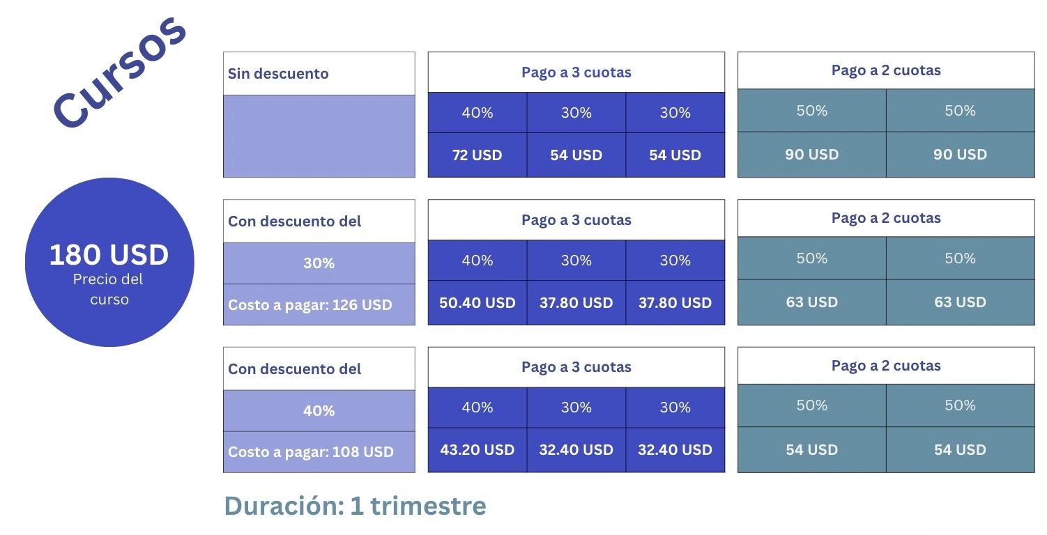 En algunos programas ofrecemos cupones con descuentos del 30% o 40% u otros, dirigidos a perfiles específicos (instituciones con convenio, grupos, participantes de procesos formativos, etc.). Estas facilidades son parte de nuestro compromiso por ampliar el acceso a la formación. Los valores con descuento son orientativos y buscan ayudarte a planificar. Por ejemplo: